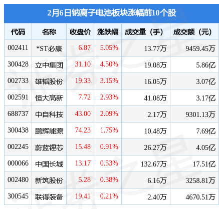 2月6日钠离子电池板块较上一交易日下跌0.96%,七彩化学(300758)领跌。当日上证指数报收于3238.7,下跌0.76%。深证成指报收于11912.56,下跌1.18%。钠离子电池板块个股涨跌见下表:
