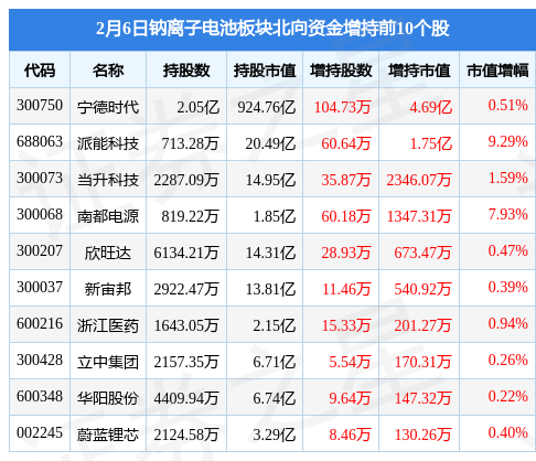 北向资金方面,当日钠离子电池板块北向资金持股市值为1047.84亿元,增持6.19亿元。其中增持最多的是宁德时代(300750),增持了4.69亿元。减持持最多的是雄韬股份(002733),减持了0.22亿元。钠离子电池板块北向资金持股变动明细见下表: