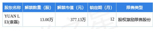 根据市场公开信息整理,南大光电(300346)(300346)于2月20日将有13.0万股限售股份解禁上市,为公司股权激励限售股份,占公司总股本0.02%。最近一年内,该股累计解禁1548.04万股,占总股本的2.85%。本次解禁后,公司还有3034.45万股限售股份,占总股本5.58%。具体如下图所示: